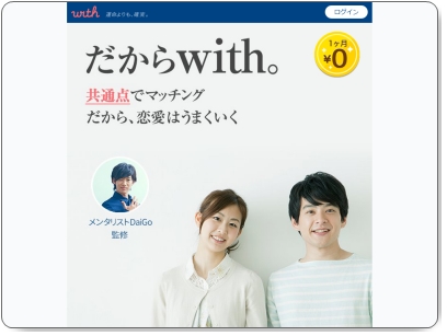 >>With公式サイトはこちら<<メンタリストDaiGoが監修している!Withアプリとは?Withは、女性に人気のメンタリストDaiGoさんが監修していることもあり、女性の利用者化とても多くなっています。恋活マッチングアプリであるWithは、「共通点」で相手を見つけることができます。あらかじめあな...